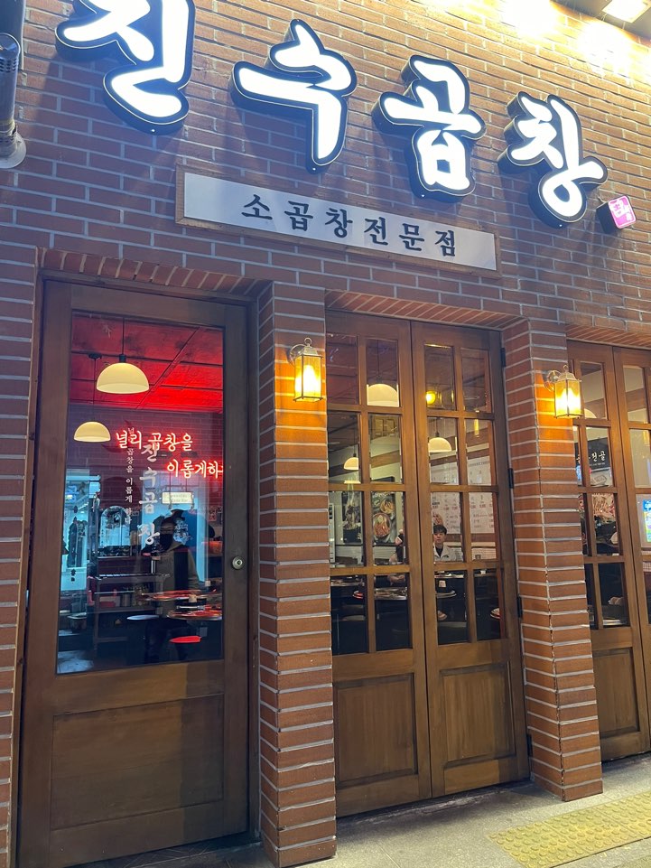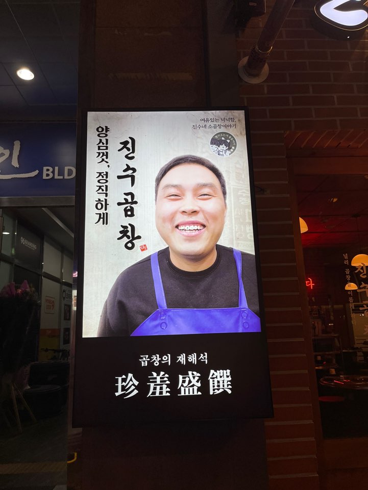 간판에 차지한 저 분이 진수씨인가요.. 진수곱창은 나무와 벽돌 느낌이 어우러진 형태의 대체로 비슷한 외관을 하고 있지요. 외관이 맘에 들어요.