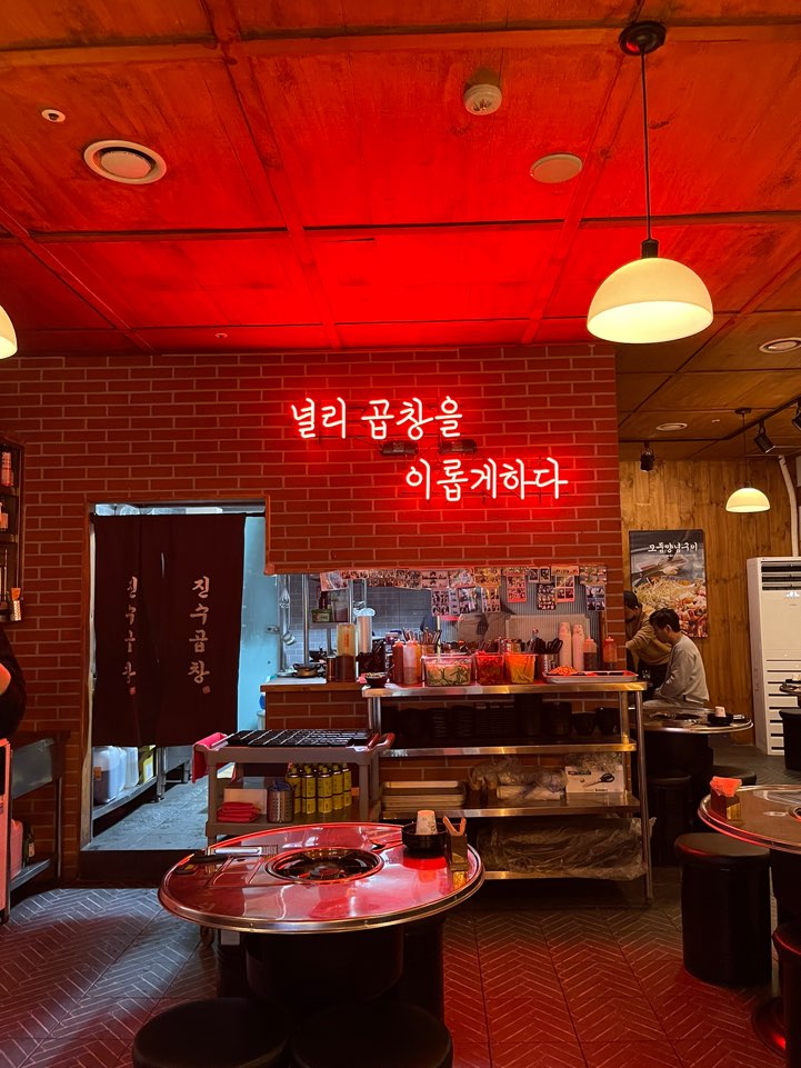 입구에 딱 들어서면 '널리 곱창을 이롭게 하라' 라는 네온사인 문구가 먼저 눈에 띕니다. 네네!!! 곱창은 사랑이죠!! 테이블은 열두개 정도 있는데 테이블을 붙일 수 있어서 여러 명 방문시에도 회식하기에도 좋아요!!