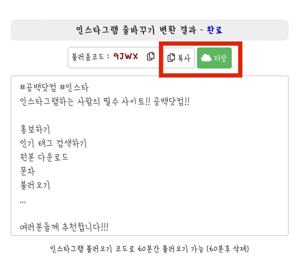 그럼 그림과 같이 변환되는데요. 아주 짧은 시간 안에 변환됩니다. 위에 작게 보이는 복사 버튼을 눌러 복사를 하고 인스타 줄 바꾸기를 진행해주시면 됩니다. 60분 후에는 자동 삭제가 되므로 보안 걱정을 하지 않으셔도 될 것 같습니다.