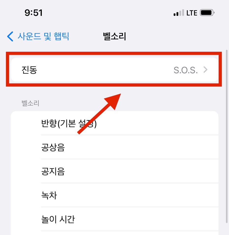 아이폰에서는 진동 패턴을 설정할 수도 있는데요. <사운드 및 햅틱>까지 들어간 상태에서 사운드 및 햅틱 패턴 메뉴 첫 번째에 위치한 <벨소리>를 눌러주세요.  화면 가장 위에 있는 <진동>을 터치해 주세요.