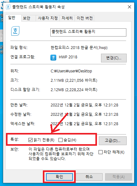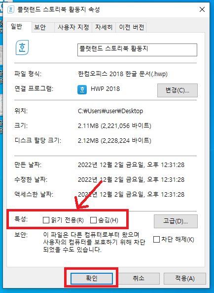 그러면 팝업이 하나 뜨게 되는데 보이는 다양한 메뉴 중 밑에 있는 위치한 특성 부분에 읽기 전용과 숨김이 보입니다. 이 중 <읽기 전용>의 왼쪽 네모 박스에 체크되어 있을 텐데요.. 네모 박스를 눌러 체크를 해제하고 확인을 눌러주면 한글 읽기 전용 해제가 완료됩니다.