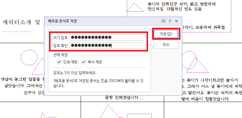 배포용 문서로 저장하기 위한 팝업 창이 뜨는데 여기에서 5자 이상 비밀번호를 쓰기 암호와 암호 확인 각각 두 곳 모두 동일하게 입력합니다. 그다음 보안의 중요성에 따라 옵션으로 인쇄 제한 및 복사 제한을 선택하고 저장 버튼을 누르면 배포용 문서로 저장됩니다.