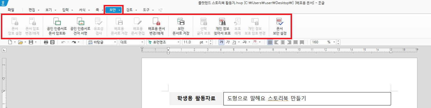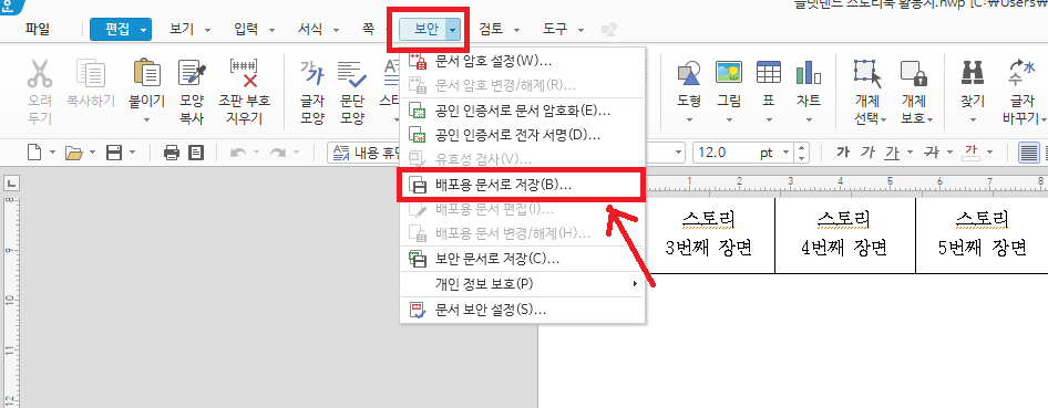 우선 배포용 문서를 만들고자 하는 한글 파일을 열고 상단 메뉴의 <보안> 탭에 들어간 다음 <배포용 문서로 저장> 버튼을 누릅니다.