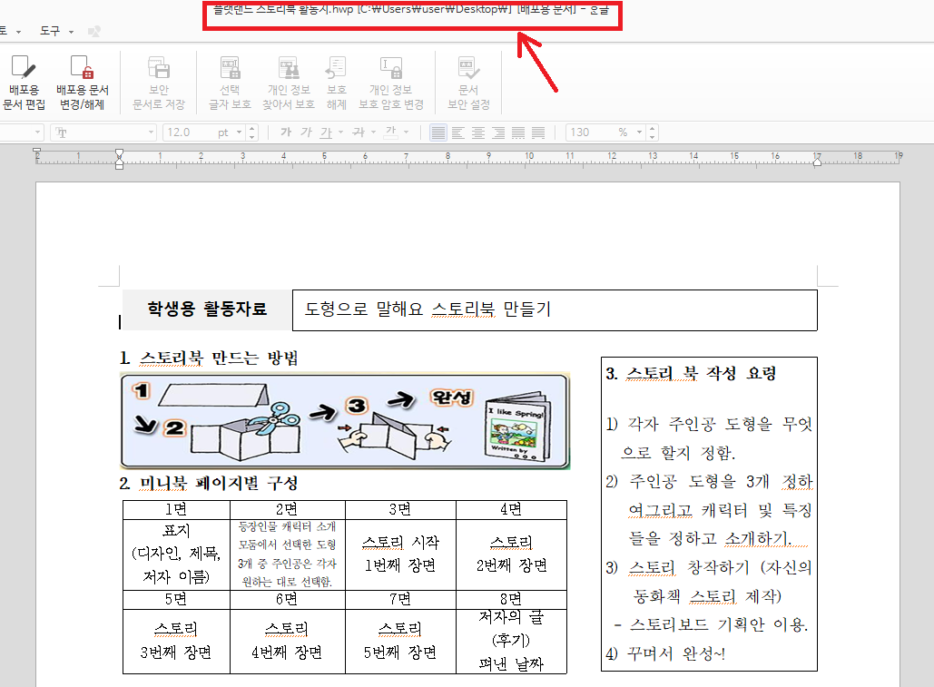 문서 상단에 배포용 문서라는 문구가 적힌 것을 확인할 수 있습니다.. 배포용 문서는 일반 편집을 비롯하여 다른 이름으로 저장까지 완전히 차단하고 있어요