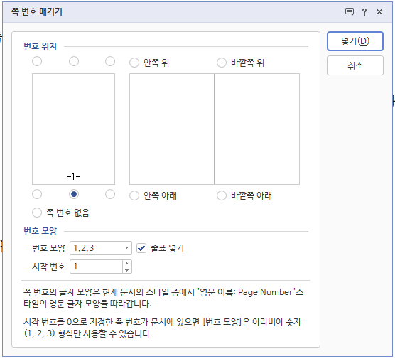새 순번 시작 설정을 위한 팝업창이 나오는데요. 쪽번호 선택 후 시작을 1로 설정하고 <넣기> 버튼만 눌러 주면 끝입니다. 시작번호를 마음대로 수정할 수 있으니 때에 따라 자유롭게 사용하시면 되겠습니다.