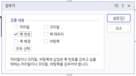 팝업창이 뜨는 데 감출 내용 중에서 <쪽 번호>에 체크하고 <설정> 버튼을 눌러 완료합니다.