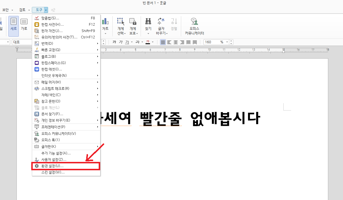이번에는 맞춤법 도우미 자체를 해제하는 방법을 알아보겠습니다. 상단의 메뉴 중에서 [도구]를 누르고 [환경설정] 버튼을 클릭해주세요.