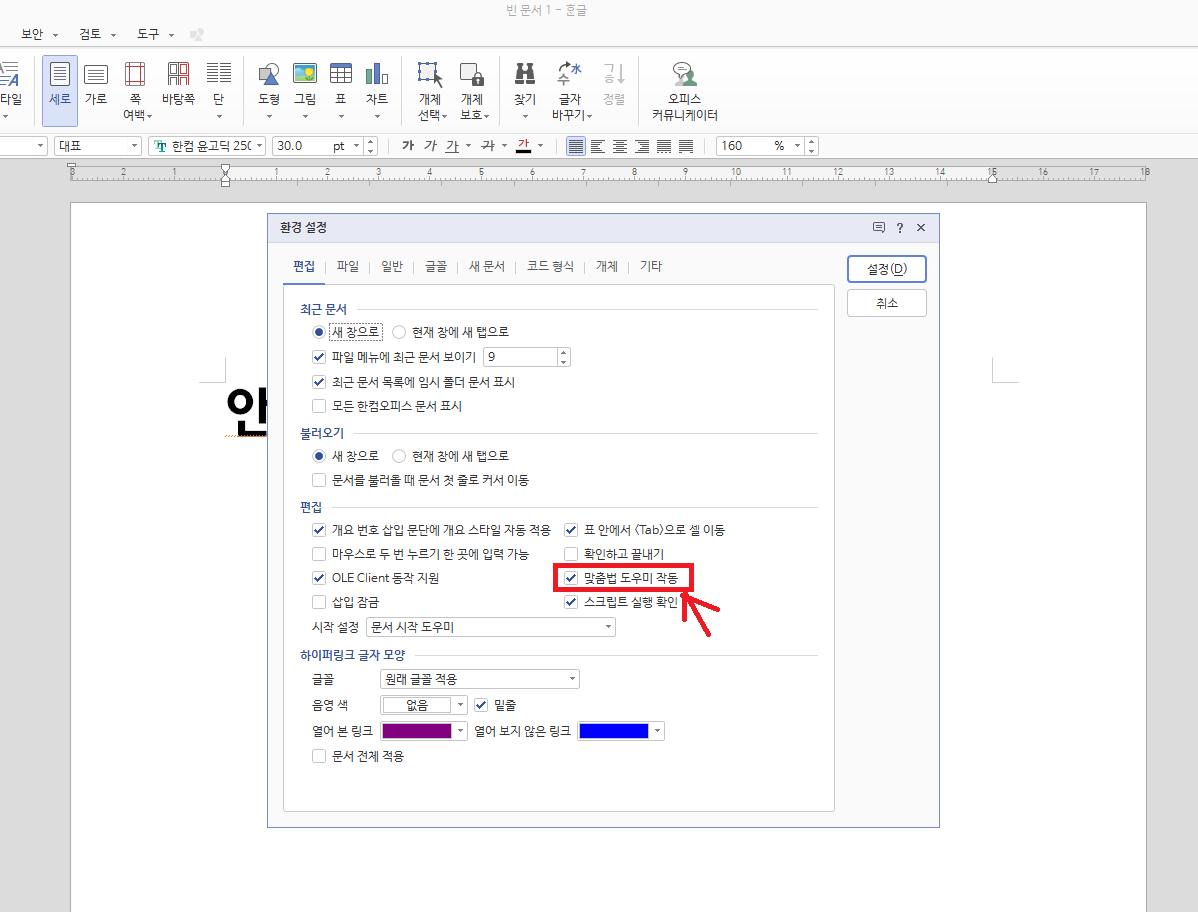 한글 빨간 줄 없애기 맞춤법 도우미 끄기