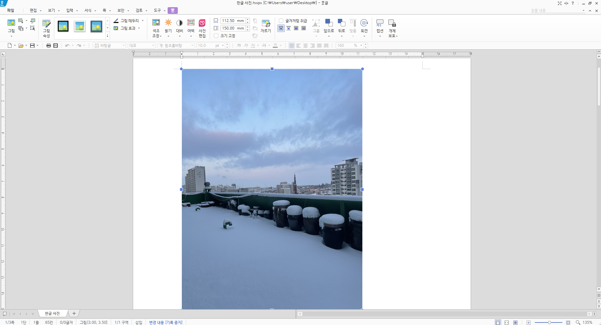 일단 사진 한글에 사진 3개를 넣었는데요. 실제로 용량이 많이 차지하는지 보도록 하겠습니다.