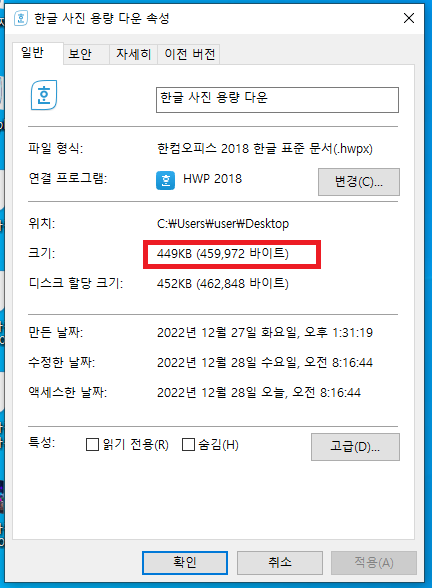 아까는 6.48MB였던 한글 파일 용량이 449KB로 줄어든 걸 확인할 수 있네요. 확실히 파일 용량이 많이 줄어든 것을 볼 수 있습니다. “해상도가 내려가면 사진 화질이 안 좋아지지 않을까요?”라고 생각할 수 있는데요. dpi를 줄여도 용량은 줄어들었지만 사진 화질이 나쁘진 않았습니다. dpi 설정을 조절할 수도 있으니 걱정하지 마세요.
