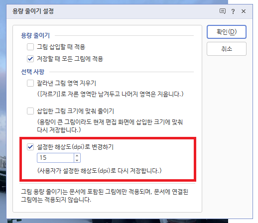 새로운 창이 하나 뜨는데 여기에서 설정한 해상도(dpi)로 변경하기에 있는 체크박스를 클릭하고 기본적으로 150으로 설정된 해상도를 원하는 수치에 맞게 설정해주시면 됩니다. 저는 '15'로 설정해 봤어요. 이때 설정하는 순간 모든 사진의 해상도가 내려가므로 신중하게 하셔야 합니다. 그래서 아까 다른 이름으로 저장을 해두었죠. 알맞은 해상도를 설정하셨으면 확인해줍니다. 이제 파일을 저장하고 용량을 확인해 보도록 하겠습니다.