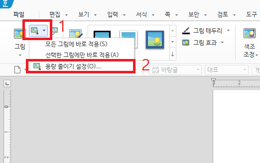 이 파일을 한번 줄여보도록 하겠습니다. 이미지를 클릭하면 메뉴바에 <그림 설정> 메뉴들이 뜨게 되는데요. 이 부분을 확대해서 보면 그림 모양의 아이콘들이 쭉 나옵니다. 그중에서 작은 아이콘을 클릭한 후 <용량 줄이기 설정>을 눌러주세요.