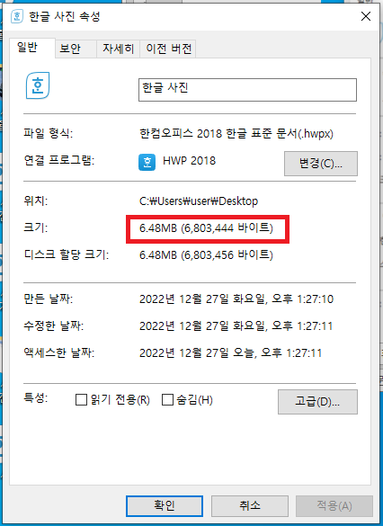 일단 사진 한글에 사진 3개를 넣었는데요. 실제로 용량이 많이 차지하는지 보도록 하겠습니다.
