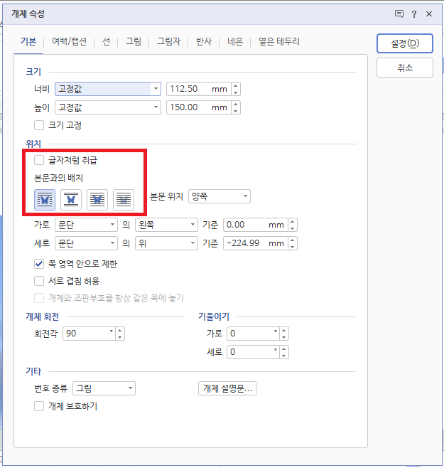 이때 사진이 “글자처럼 취급” 설정이 되어 있다면 회전 기능을 사용할 수 없으니 주의해 주세요. 이때는 글자처럼 취급을 반드시 해제해 주어야만 회전 기능을 사용할 수 있습니다.