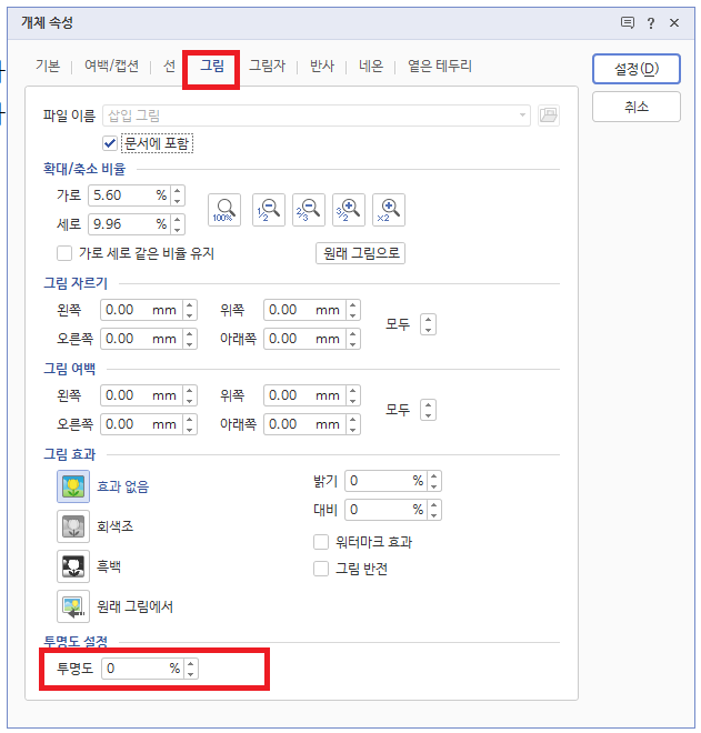 이때 문서가 더 잘 보이게 하기 위해서는 투명도를 조절하면 되는데요. 다시 속성으로 들어가 그림 탭에 들어가면 설정할 수 있습니다. 기본 상태가 0%인데 값을 조절하면서 적당한 수치로 설정해주세요.