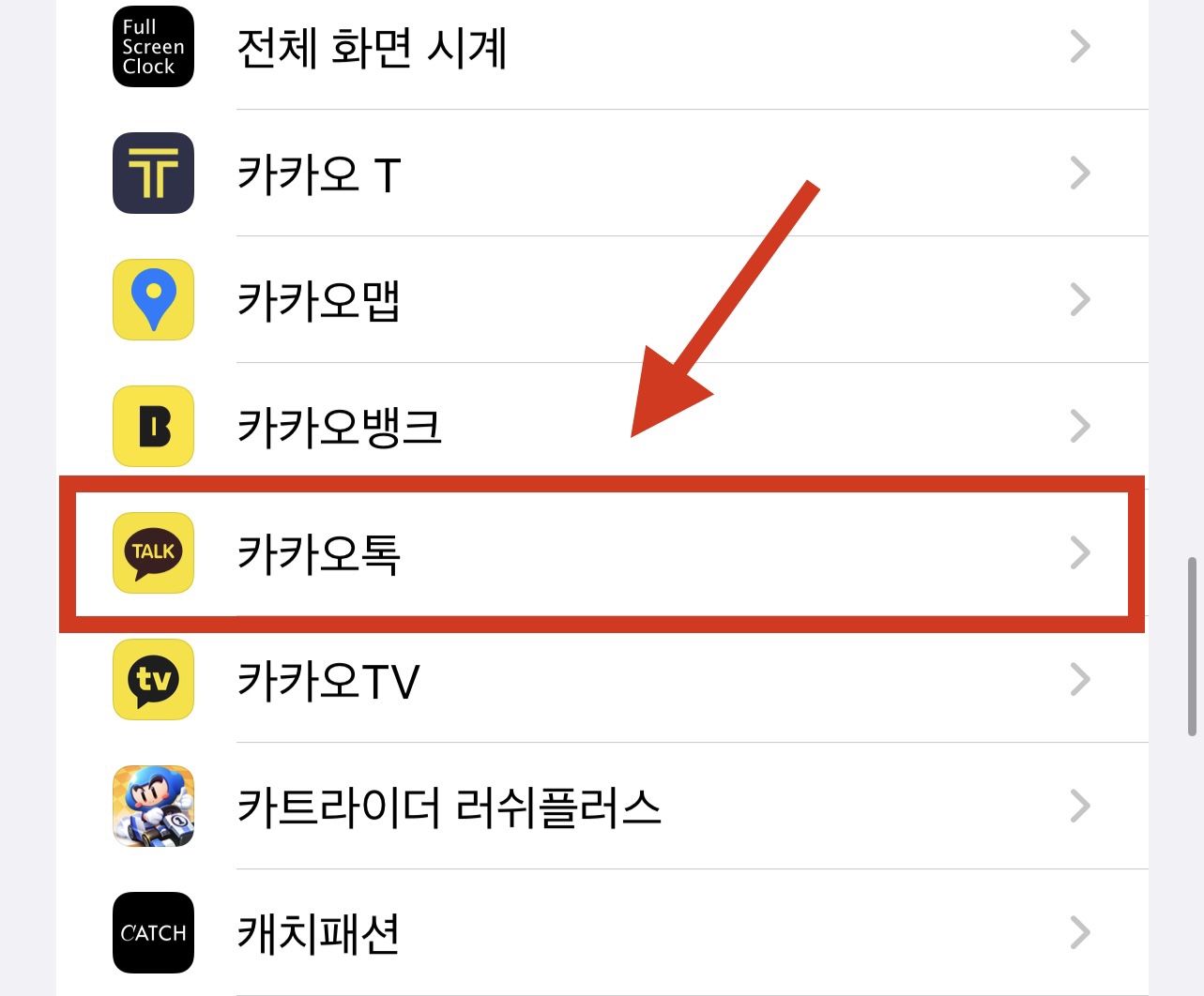스크롤을 쭉 내려 <카카오톡> 탭을 찾아 눌러줍니다. 설치한 앱이 많을수록 스크롤을 많이 내려야 할 수도 있으니 쭉 내려주세요.