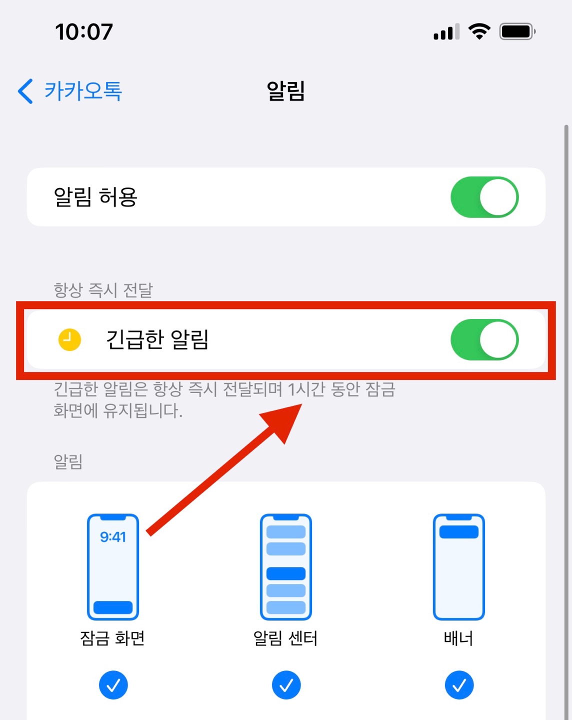 여기에서 두 번째 항목에 노란색 시계표시가 있는 <긴급한 알림> 탭이 있는데요. 초록색으로 활성화된 부분을 한 번 더 눌러주어 회색으로 비활성화 시켜줍니다.