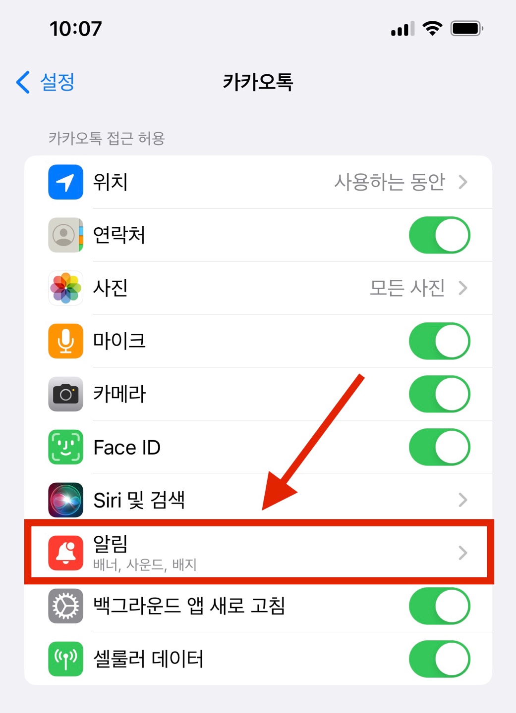 카카오톡 설정으로 들어가면 허용할 수 있는 많은 메뉴가 나오는데 그중에서 알림을 찾아 눌러줍니다.