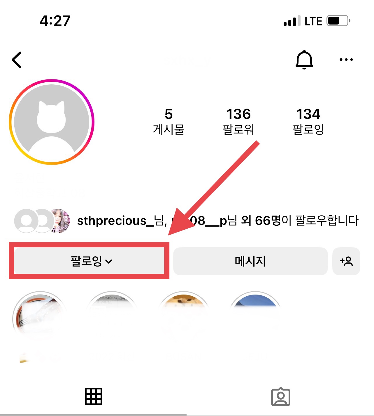 먼저 상대방의 피드로 들어가서 프로필 밑에 있는 <팔로잉> 버튼을 눌러줍니다.