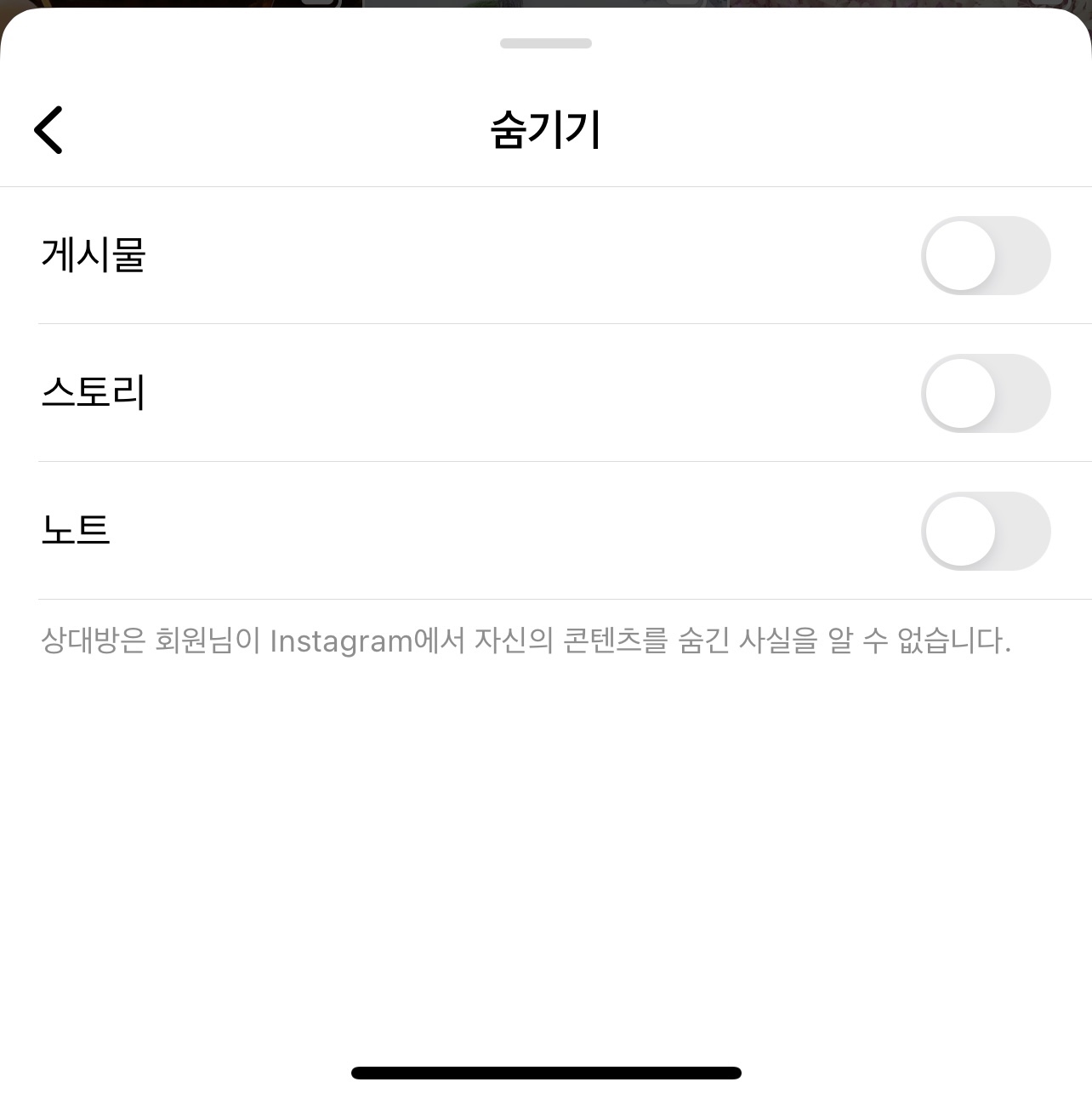 이곳에서는 게시물과 스토리, 노트 기능에 관해 볼지 숨길지를 선택할 수 있으니 보고 싶지 않은 항목은 숨기기를 활성화하면 됩니다. 이때 상대방은 내가 인스타그램에서 자신의 콘텐츠를 숨긴 사실을 알 수 없으니 안심하고 사용하시면 됩니다. 상대방의 인스타 메모가 보이지 않는다면 이곳을 확인해보시면 됩니다. 아직도 상대방의 인스타 메모가 뜨지 않는다면 인스타그램 앱을 완전 종료 후에 다시 실행해 보시기를 권유합니다.