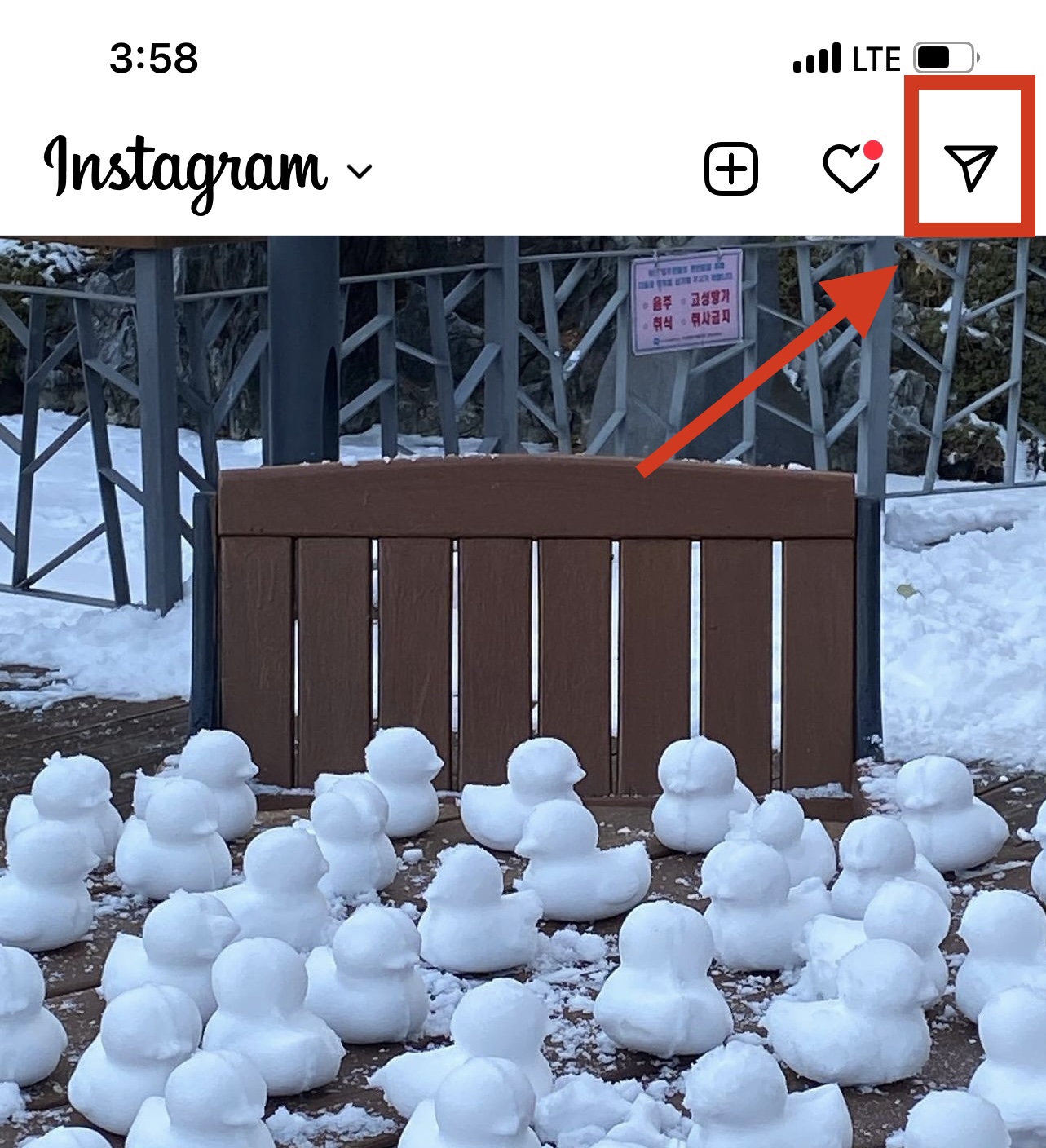 인스타그램 앱에 접속한 후 오른쪽 위에 있는 비행기 모양의 DM 메시지 아이콘을 눌러줍니다.