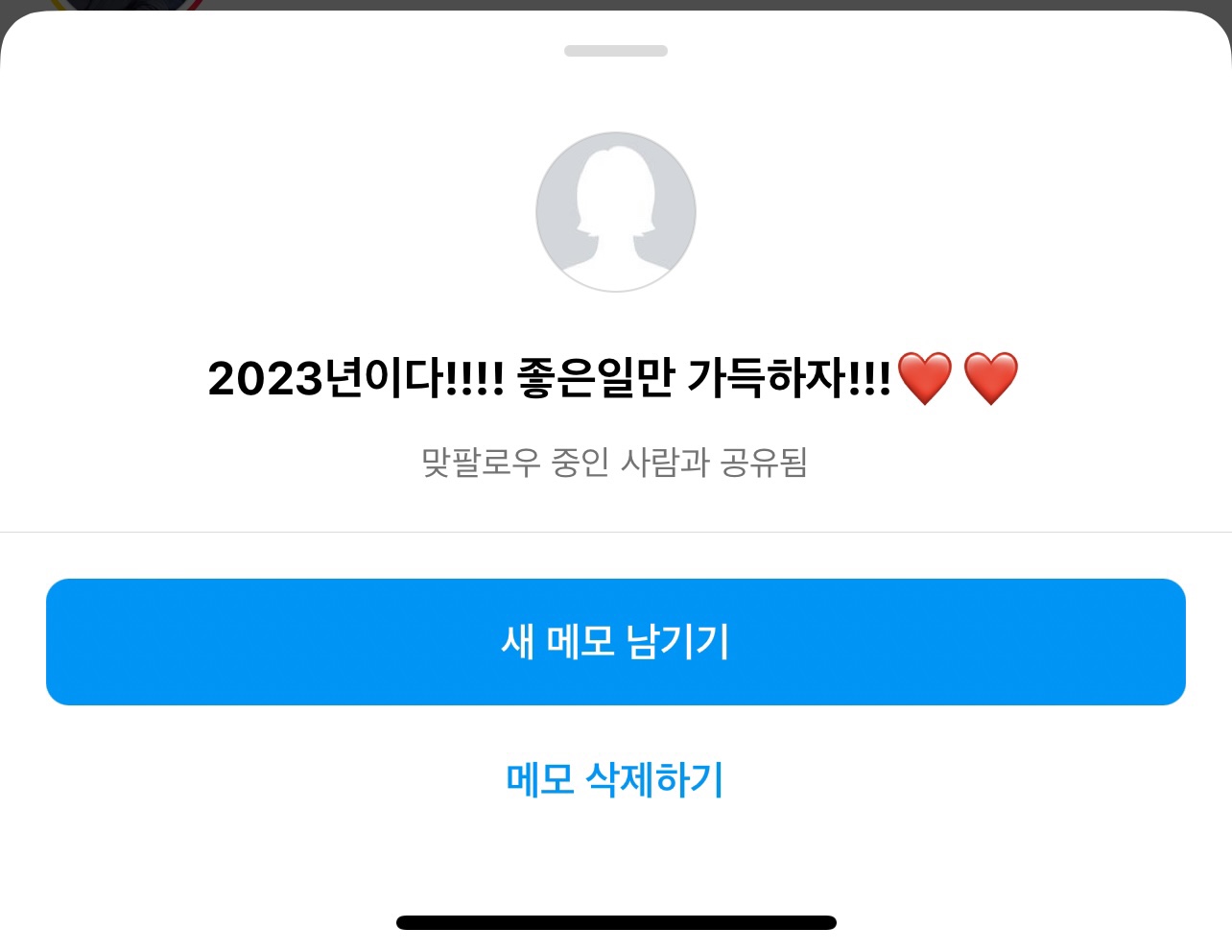 다시 프로필을 누르면 새로운 메모를 남길 수도 있고 방금 남겼던 메모를 삭제할 수도 있으니 참고해주세요.