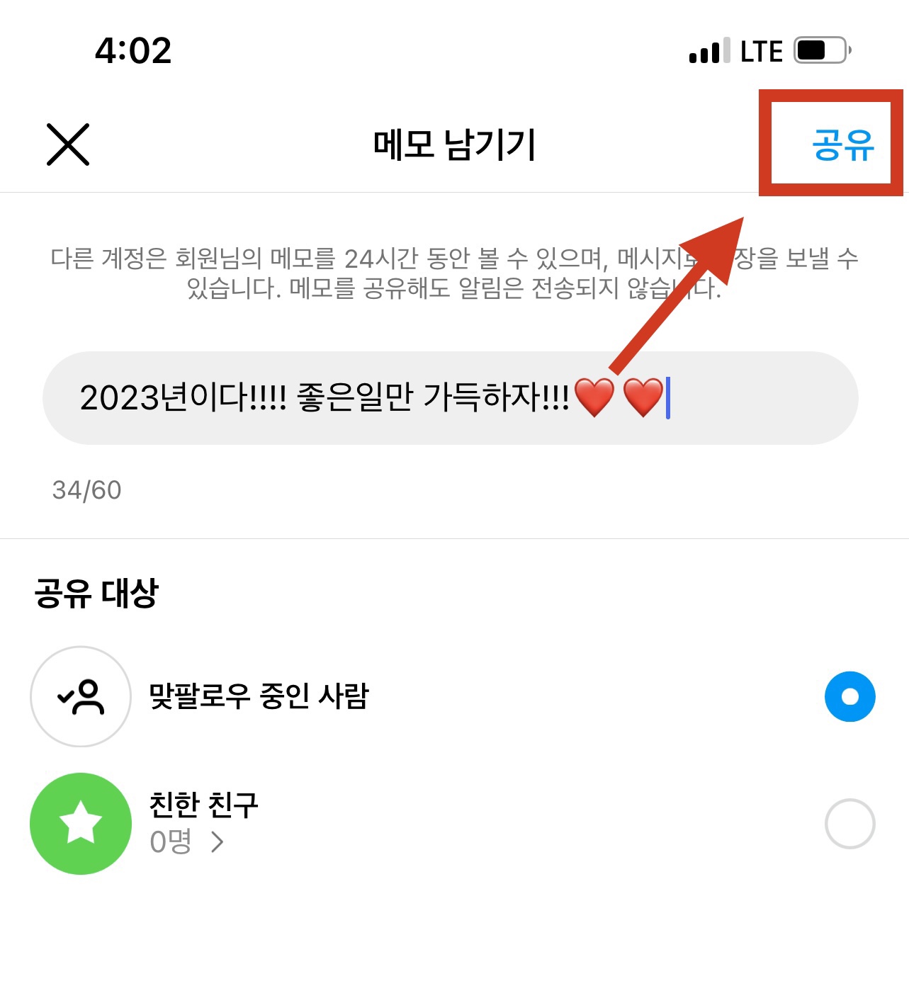메모를 적을 수 있는 칸에 얘기하고 싶은 내용을 적고 오른쪽 위에 있는 <공유> 버튼을 눌러줍니다. 그럼 메모가 공유되고 있음을 확인할 수 있습니다.