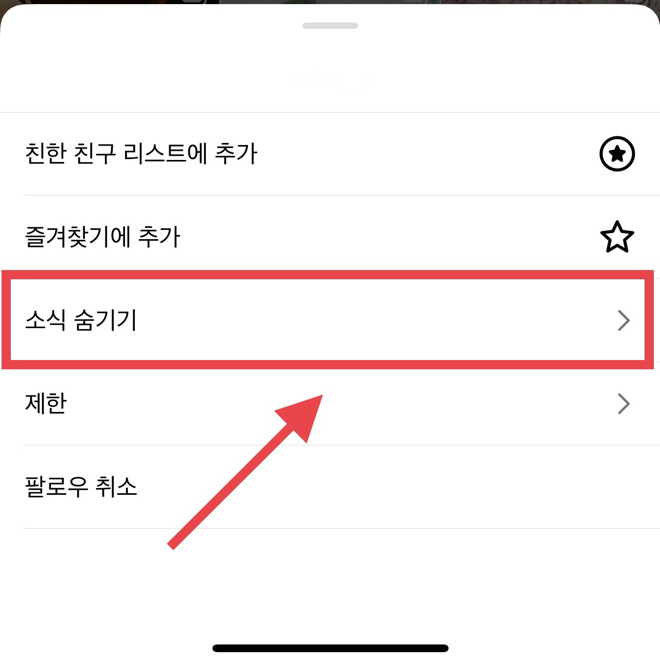그러면 관련 메뉴 리스트가 나타납니다. 이 중에 세 번째에 있는 <소식 숨기기> 항목을 선택합니다.