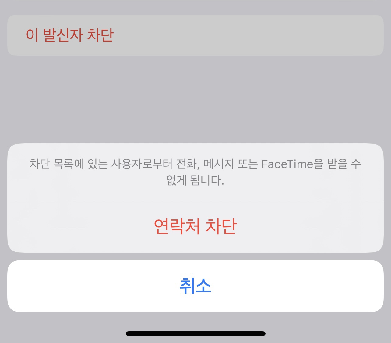 이제 차단 목록에 있는 사용자로부터 전화, 메시지, FaceTime을 받을 수 없게 된다는 안내와 함께 <연락처 차단>이 나타납니다. 연락처 차단을 누르시면 해당 번호는 스팸 문자로 인식되어 차단됩니다.
