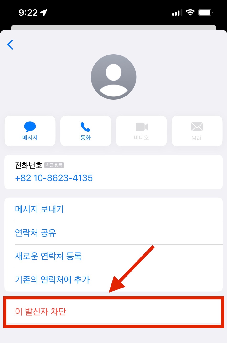 메시지 보내기, 연락처 공유, 새로운 연락처 등록, 기존의 연락처에 추가 등의 메뉴가 있는데요. 아이폰 스팸 문자 차단을 위해 맨 아래에 있는 <발신자 차단>을 눌러줍니다.