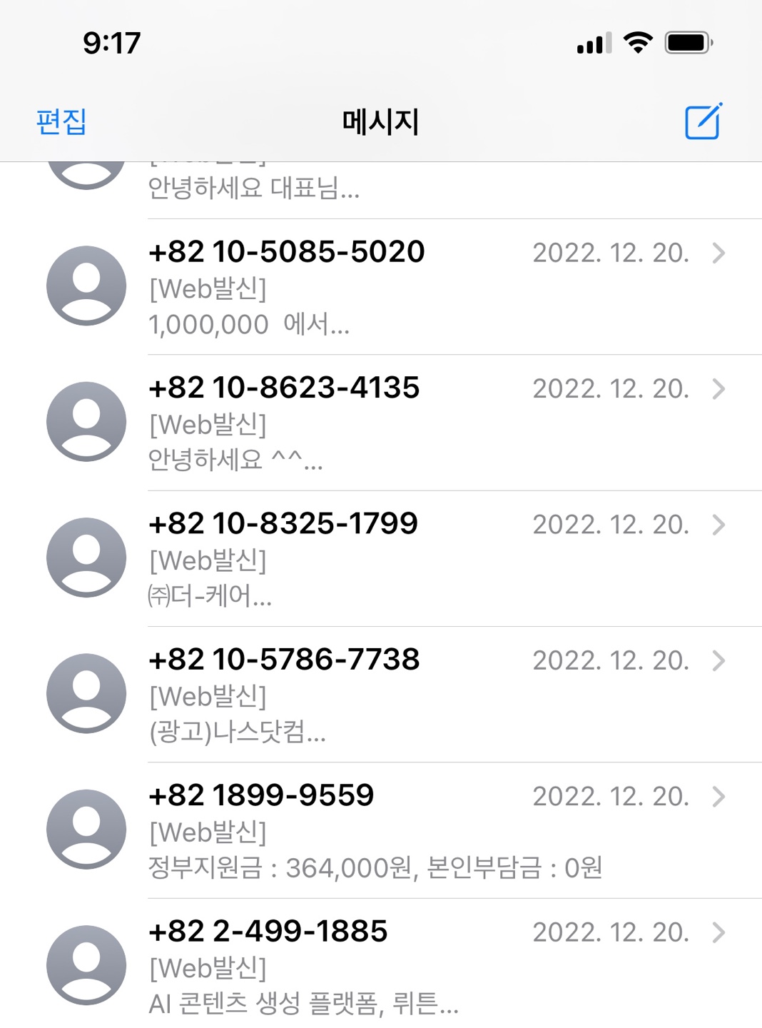 아이폰에서 문자 앱을 실행합니다. 한눈에 봐도 스팸 문자가 가득합니다. 차단하고 싶은 스팸 문자를 눌러줍니다.