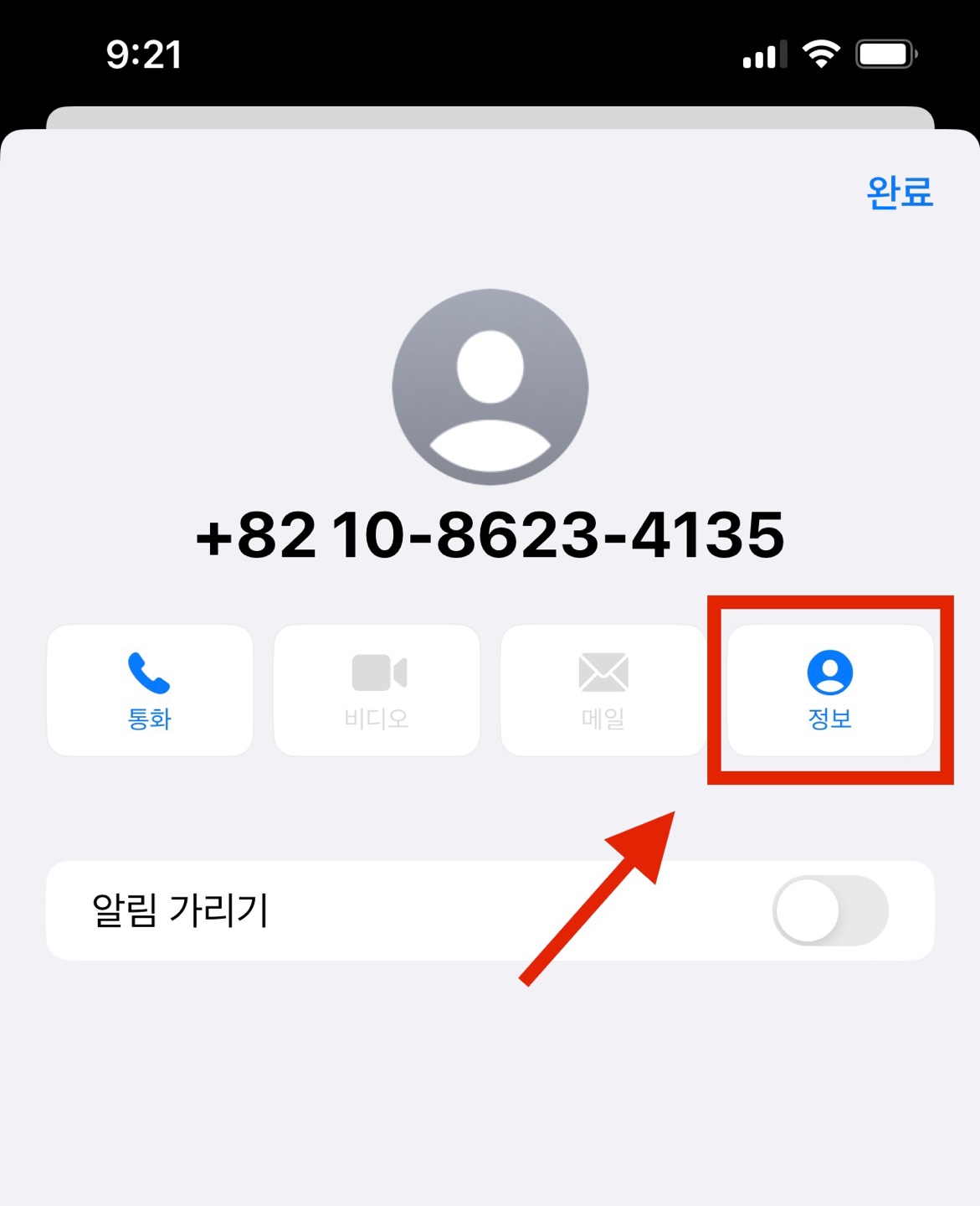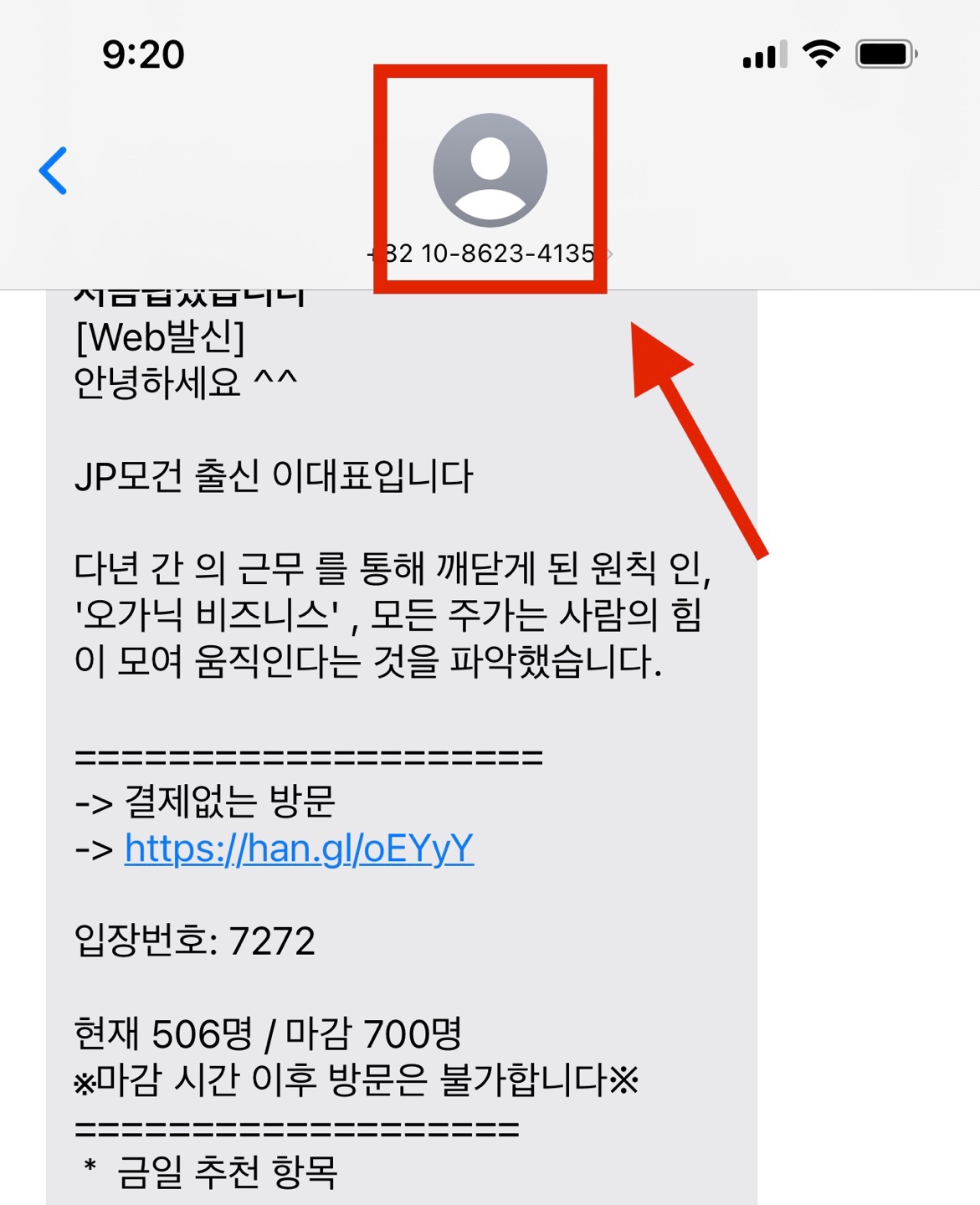 차단해도 되는 내용인지 다시 한번 확인해주세요. 차단해도 되는 연락처라면 상단에 있는 사람 모양의 <프로필>을 눌러줍니다.