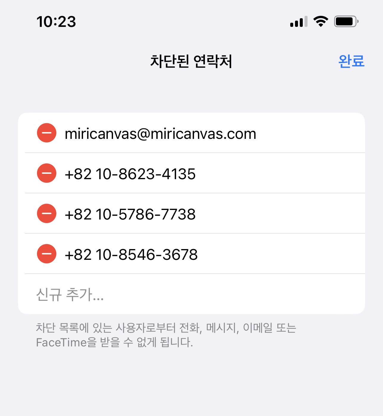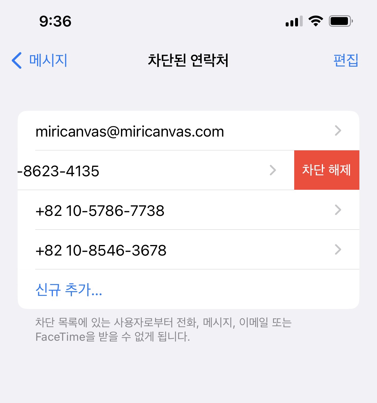 지금까지 차단했던 번호들이 쭉 나열되는데요. 차단 해제하고 싶은 번호를 오른쪽에서 왼쪽으로 밀어 <해제> 버튼을 선택하면 됩니다.