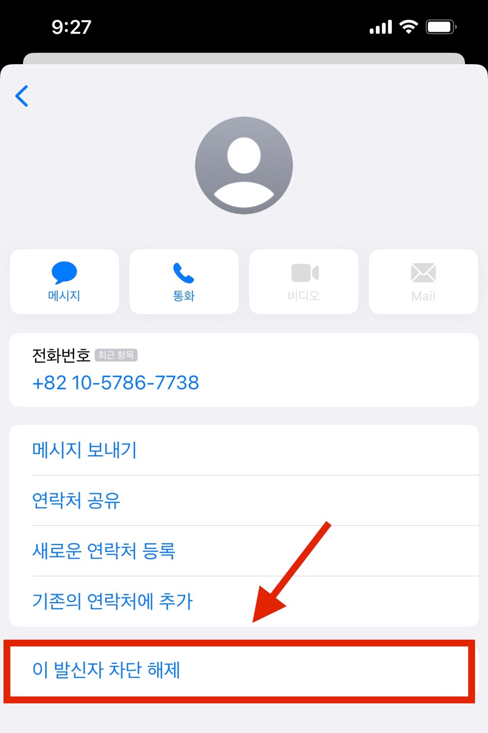 첫 번째 방법은 방금 차단했던 그 화면에서 다시 <발신자 차단 해제>를 눌러주는 방법입니다.