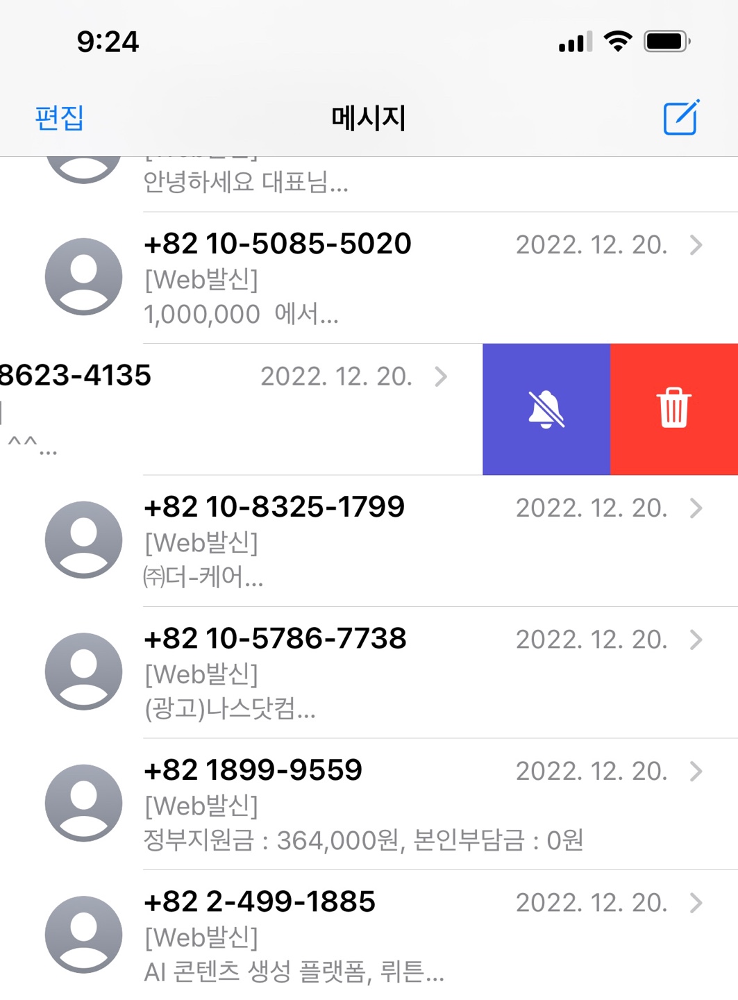 아이폰에서 문자 앱을 실행합니다. 한눈에 봐도 스팸 문자가 가득합니다. 차단하고 싶은 스팸 문자를 눌러줍니다.