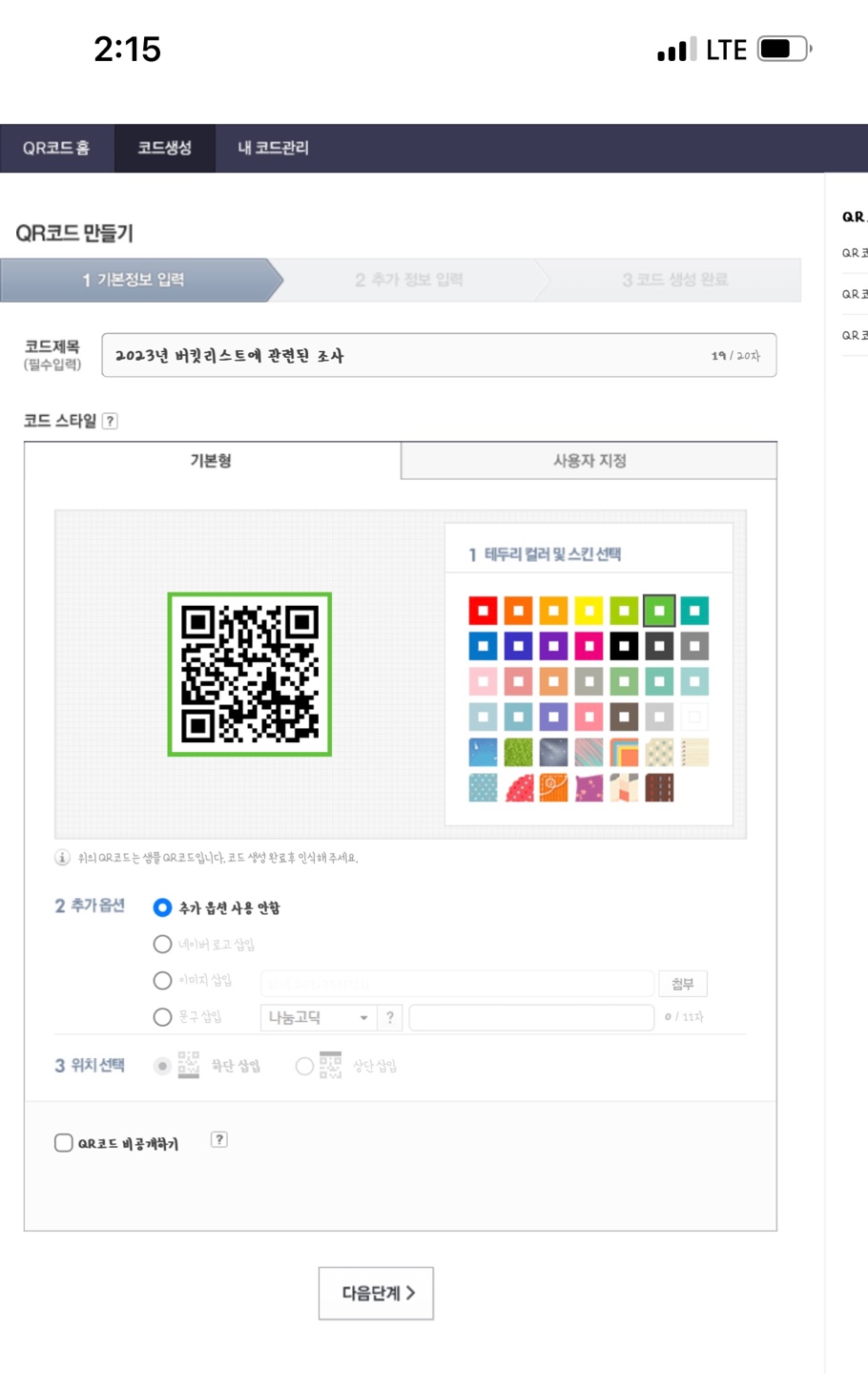 QR코드 만들기 기본정보를 입력하는 창이 뜨고 여기에서는 기본 설정과 사용자 지정을 선택할 수 있는데요. 기본형은 네이버에서 제공되는 기본 틀이며 사용자 지정은 설정이 변경 가능합니다.