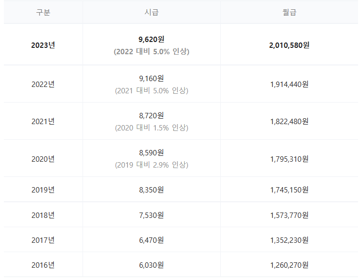 2023년 최저임금은 2022년 최저임금 9160원에서 5% 인상한 9620원입니다. 최저임금으로 월급을 계산하면 2,010,580원으로 이번에 최저임금이 인상되면서 최초로 월급 계산 기준액이 200만 원이 넘었다는 부분은 큰 이슈가 되기도 했습니다.