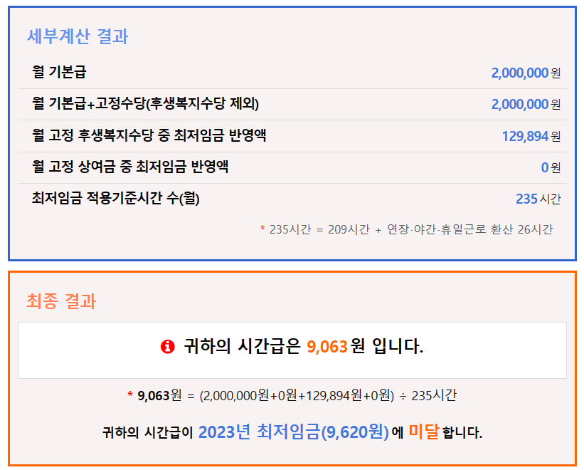 2023년 최저임금을 정확하게 계산하고 싶다면 네이버 최저임금 계산기를 사용해도 좋고, 더 자세하게 활용하고 싶다면 ‘노동ok’ 사이트를 이용해도 됩니다. ‘노동OK’에서 자동계산 탭 중 ‘2023년 최저임금’에 들어간 후 급여 형태, 사업장규모, 1주 근무 시간을 선택하고 월 고정수당과 월 후생 복지 수당, 월 고정 상여급을 입력하면 다음 사진과 같이 시간급을 계산하여 현재 최저임금에 초과하는지 미달하는지를 파악해줍니다.
