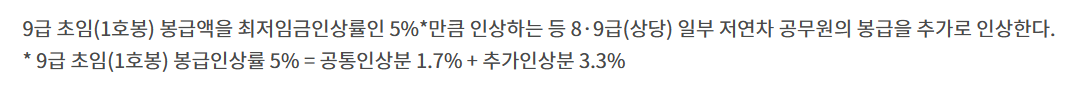 추가로 91호봉의 경우 2023년 공무원 봉급표에서 최저임금 인상률에 맞추어 5%를 인상을 결정했습니다. 9급 초임의 경우 기본 인상률 1.7%와 추가 인상분으로 3.3%를 합하여 5%의 인상률을 보입니다.