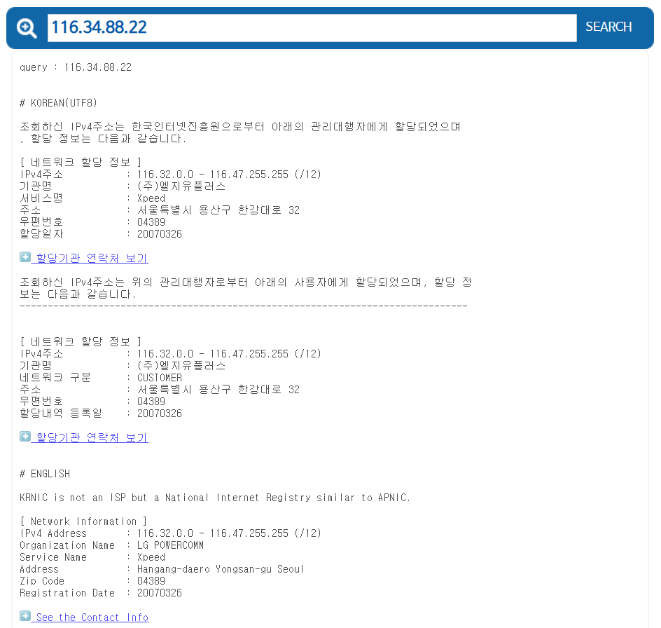 그리고 아까 검색창에서 조회했던 공인 ip를 입력하고 조회 버튼을 누르면 아이피 할당 정보가 나옵니다. 관리하는 기관명, 주소를 확인할 수 있고, 대한민국이라는 지리적인 위치까지 파악 가능합니다.