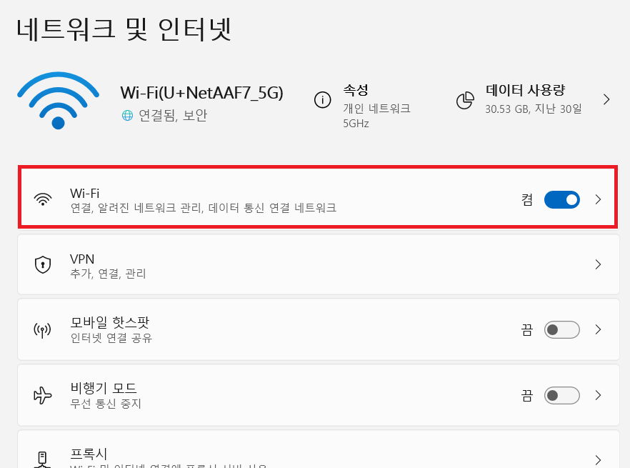 두 번째 내 아이피 주소 확인 방법은 오른쪽 아래에 있는 작업 표시줄 와이파이 아이콘에서 오른쪽 버튼을 누르고 설정에 들어가면 와이파이를 확인할 수 있는데요.