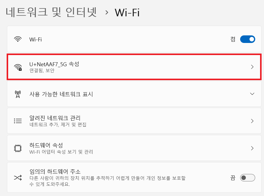 연결된 와이파이가 나타나고 속성을 눌러줍니다. 아래로 스크롤을 내리면 IPv4를 찾아 확인할 수 있습니다.