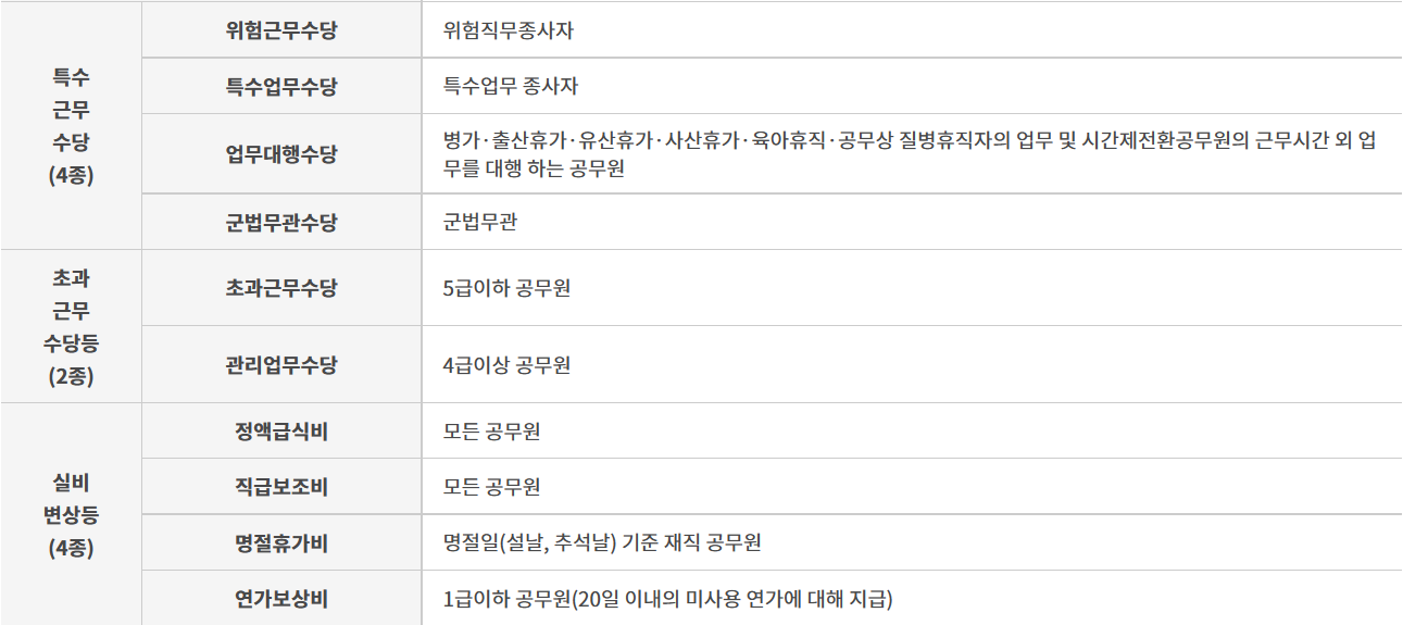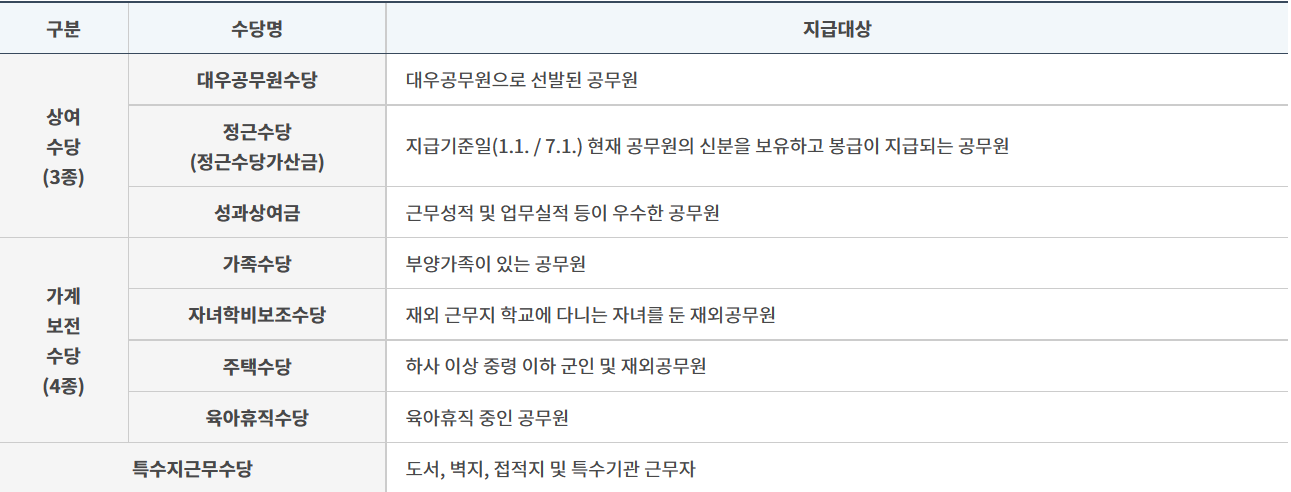 | 공무원 수당은 공무원에게 지급되는 보수 중의 일부로서 직무여건 및 생활여건 등에 따라 지급되는 부가급여를 말한다. 「공무원수당 등에 관한 규정」에 따라 5개 분야 14종으로 구분되며, 동 규정은 실비변상 4종도 함께 규정하고 있다. 동 규정은 국가공무원에게 적용되며, 지방공무원에게 지급되는 수당 및 실비변상은 「지방공무원수당 등에 관한 규정」에 따라 별도로 규정하고 있다. 각각의 수당 및 실비변상에 대해 자세히 살펴보면 다음과 같다. 상여수당(3종)은 상위직급의 대우공무원으로 선발된 공무원에게 지급하는 대우공무원수당, 근무연수에 따라 지급되는 정근수당, 근무실적 등이 우수한 사람에게 지급하는 성과상여금이 있다. 가계보전수당(4종)은 부양가족이 있는 공무원에게 지급하는 가족수당, 재외 근무지 학교에 다니는 자녀가 있는 재외공무원에게 지급하는 자녀학비보조수당, 군인 및 재외공무원에게 지급하는 주택수당, 육아휴직한 공무원에게 지급하는 육아휴직수당이 있다. 특수지근무수당은 교통이 불편하고 문화·교육시설이 거의 없는 지역이나 근무환경이 특수한 기관에 근무하는 공무원에게 지급한다. 특수근무수당(4종)은 위험한 직무에 종사하는 공무원에게 지급하는 위험근무수당, 특수한 업무에 종사하는 공무원에게 지급하는 특수업무수당, 병가·출산휴가·유산휴가·사산휴가, 육아휴직 또는 공무상 질병휴직 중인 공무원의 업무 등을 대행하는 공무원에게 지급하는 업무대행수당, 군법무관에게 지급하는 군법무관수당이 있다. 초과근무수당등(2종)은 5급 이하 공무원으로서 규정된 근무시간 외에 근무한 공무원에게 지급하는 초과근무수당과 4급 이상의 관리자에게 지급하는 관리업무수당이 있다. 실비변상등(4종)은 정액급식비, 명절휴가비, 연가보상비, 직급보조비가 있다. |