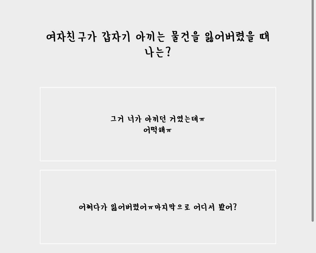 아홉 번째 질문은 여자친구가 갑자기 아끼는 물건을 잃어버렸을 때 나는?’입니다.