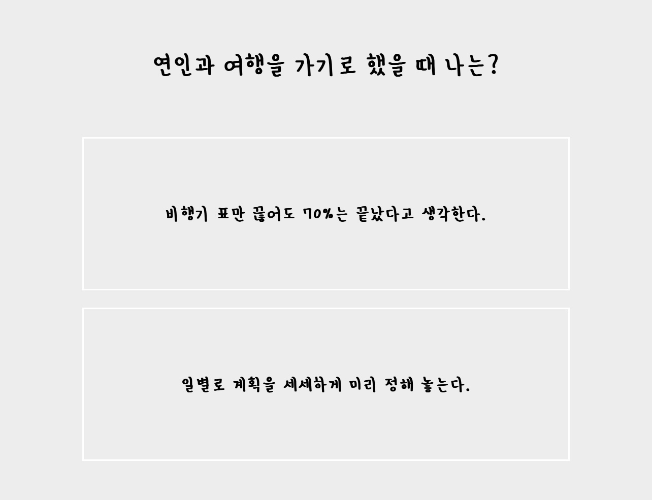 드디어 스마일 연애 테스트 마지막 질문입니다. '연인과 여행을 가기로 했을 때 나는?'입니다.