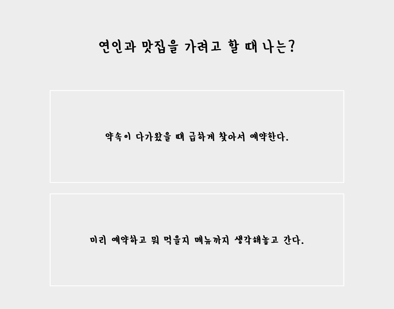 약속이 다가왔을 때 급하게 찾아서 예약한다. VS 미리 예약하고 뭐 먹을지 메뉴까지 생각해놓고 간다.