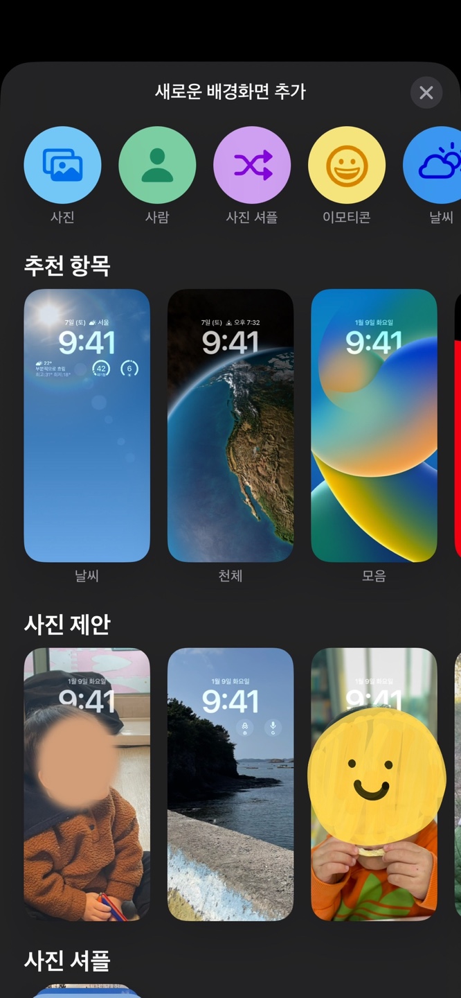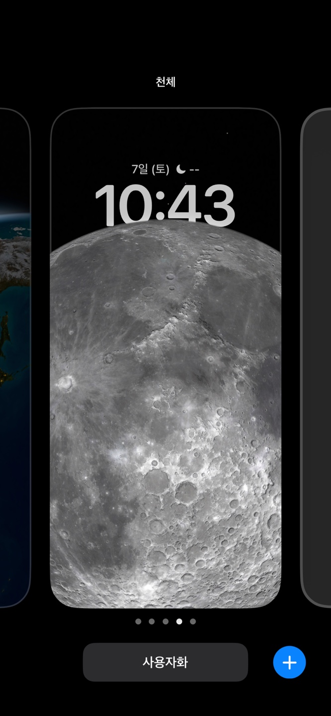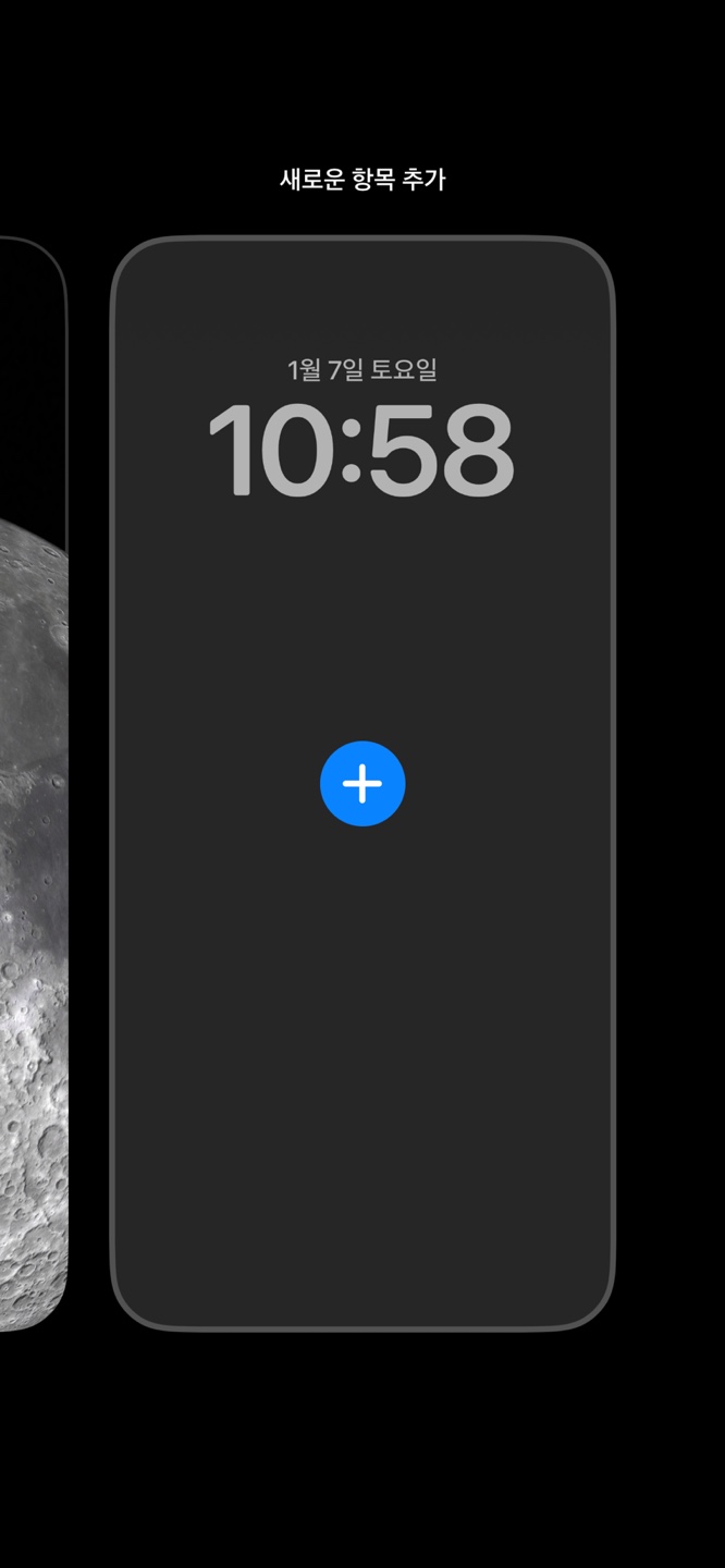 아이폰 배경 화면을 추가하고 싶다면 아까와 마찬가지 방법으로 잠금화면에서 길게 터치한 후 가장 오른쪽으로 스와이프해서 파란색의 ‘+’버튼을 눌러줍니다. 새로운 배경 화면 추가에 대한 여러 가지 설정들이 나오고 마음에 드는 배경 화면을 찾아 눌러줍니다.