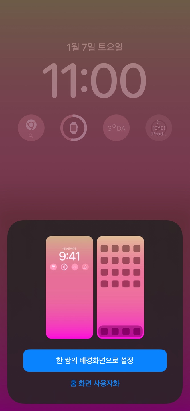 그러면 한 쌍의 배경화면으로 설정과 홈 화면 사용자화가 나오는데 보이는 배경 화면을 그대로 사용하려면 한 쌍의 배경화면으로 설정을 눌러주고 홈 화면을 조금 다르게 편집하고 싶으면 홈 화면 사용자화를 눌러 설정해 주면 됩니다.