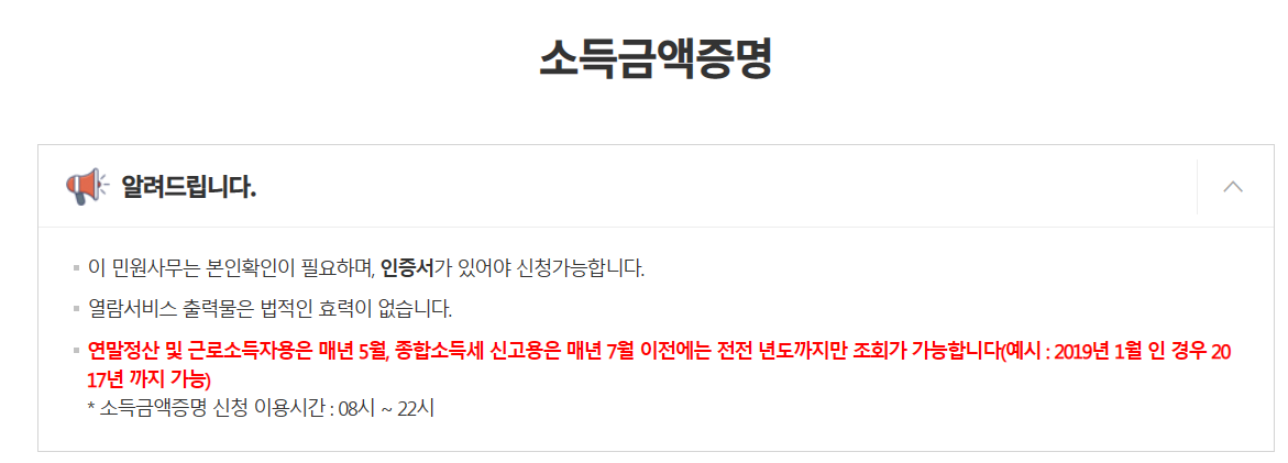 본인확인이 필요하며 인증서가 있어야 신청가능하고 열람서비스 출력물은 법적인 효력이 없다는 점에 유의해 주세요. 연말정산 및 근로소득자용은 매년 5월, 종합소득세 신고용은 매년 7월 이전에는 전전 년도까지만 조회 가능하니 참고해 주시기 바랍니다. 신청시간은 08시부터 22시까지이니 확인해주세요.