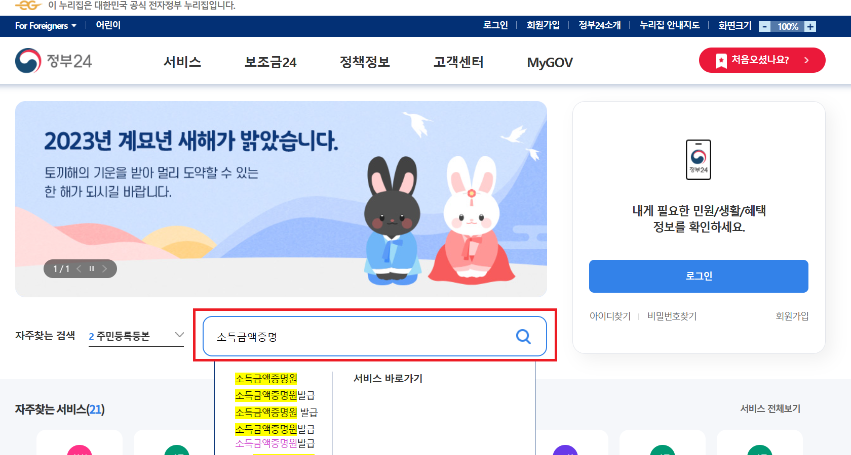 정부 24 홈 화면 가운데 위치한 검색 부분에 ‘소득금액증명원’을 검색해줍니다.
